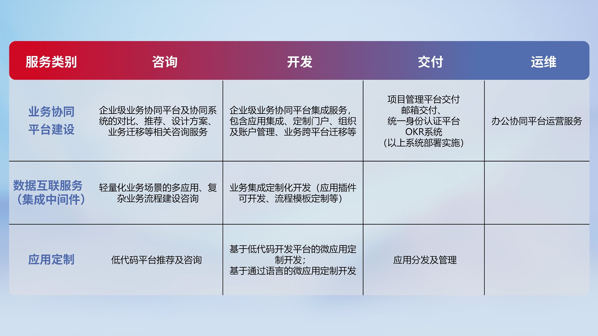 针对钉钉、、企微、、IDaas等平台级产品提供产品的规划、、方案、、交付、、、定制化开发等服务,,实现如统一协同办公、、、智能客户服务、、、混合会议管理、、智能数据查询、、等业务场景,,实现数字化转型。。